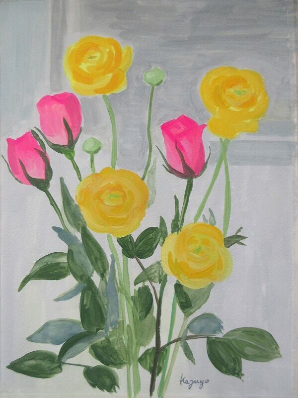 バラとラナンキュラス その1 不透明水彩(ガッシュ)F4 34.0cm×25.0cm